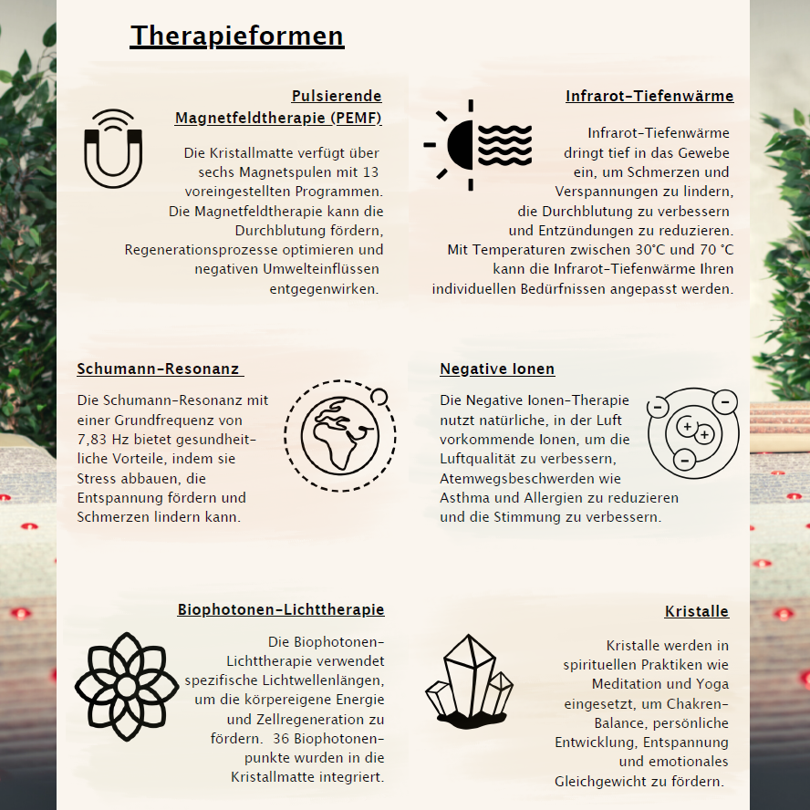 Biophotonen, Infrarot-Tiefenwärme, negative Ionen und pulsierendes Magnetfeld,